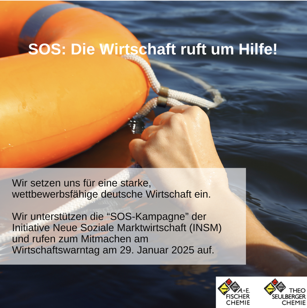 Die Initiative Neue Soziale Marktwirtschaft (INSM) hat eine „SOS-Kampagne“ ins Leben gerufen, welche auch vom Verband Chemiehandel e.V. (VCH) unterstützt wird. Auch Fischer-Chemie Wiesbaden und Theo Seulberger-Chemie Karlsruhe solidarisieren sich mit dieser Kampagne. Ihr Ziel ist es, auf die alarmierende Situation der deutschen Wirtschaft aufmerksam zu machen. Der Hintergrund: Im zweiten Jahr in Folge befindet
